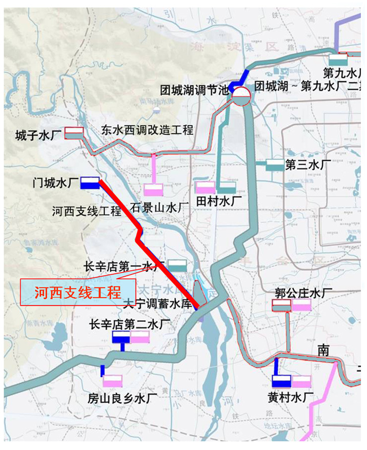河西支线工程承担向北京丰台长辛店地区和门头沟新城的供水任务,沿线设置长辛店第一水厂分水口、长辛店第三水厂分水口和门城水厂分水口。